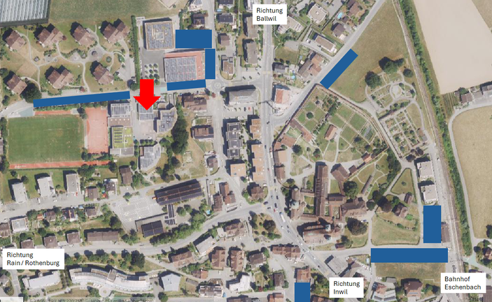 Der Lindenfeldsaal Eschenbach, in dem unser Heimatabend stattfindet, ist mit einem roten Pfeil gekennzeichnet (Adresse: Lindenfeldstrasse 7).